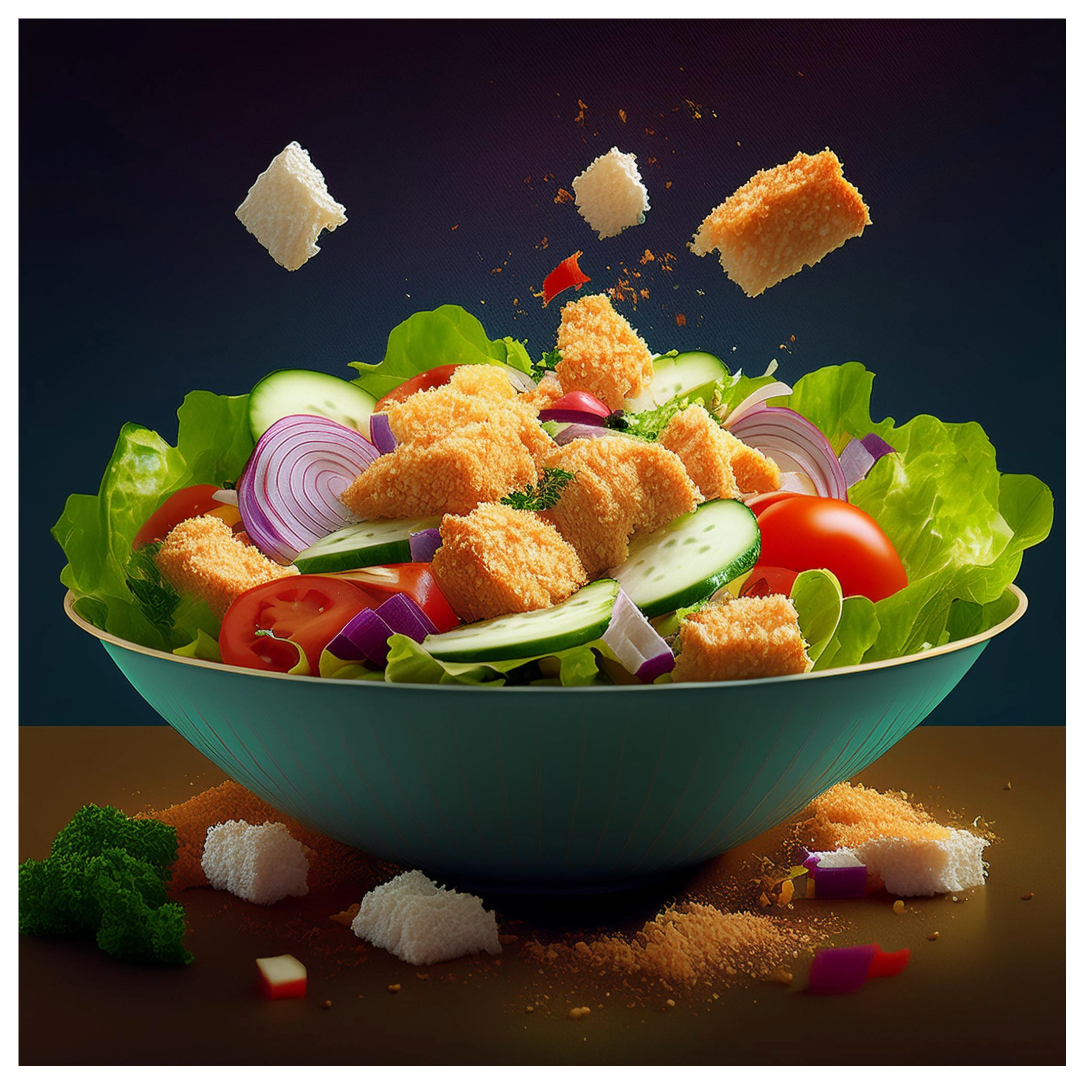 Eisbergsalat, Zwiebeln, Gurken, Tomaten, Käse, Croutons und Crispy Chicken Patty