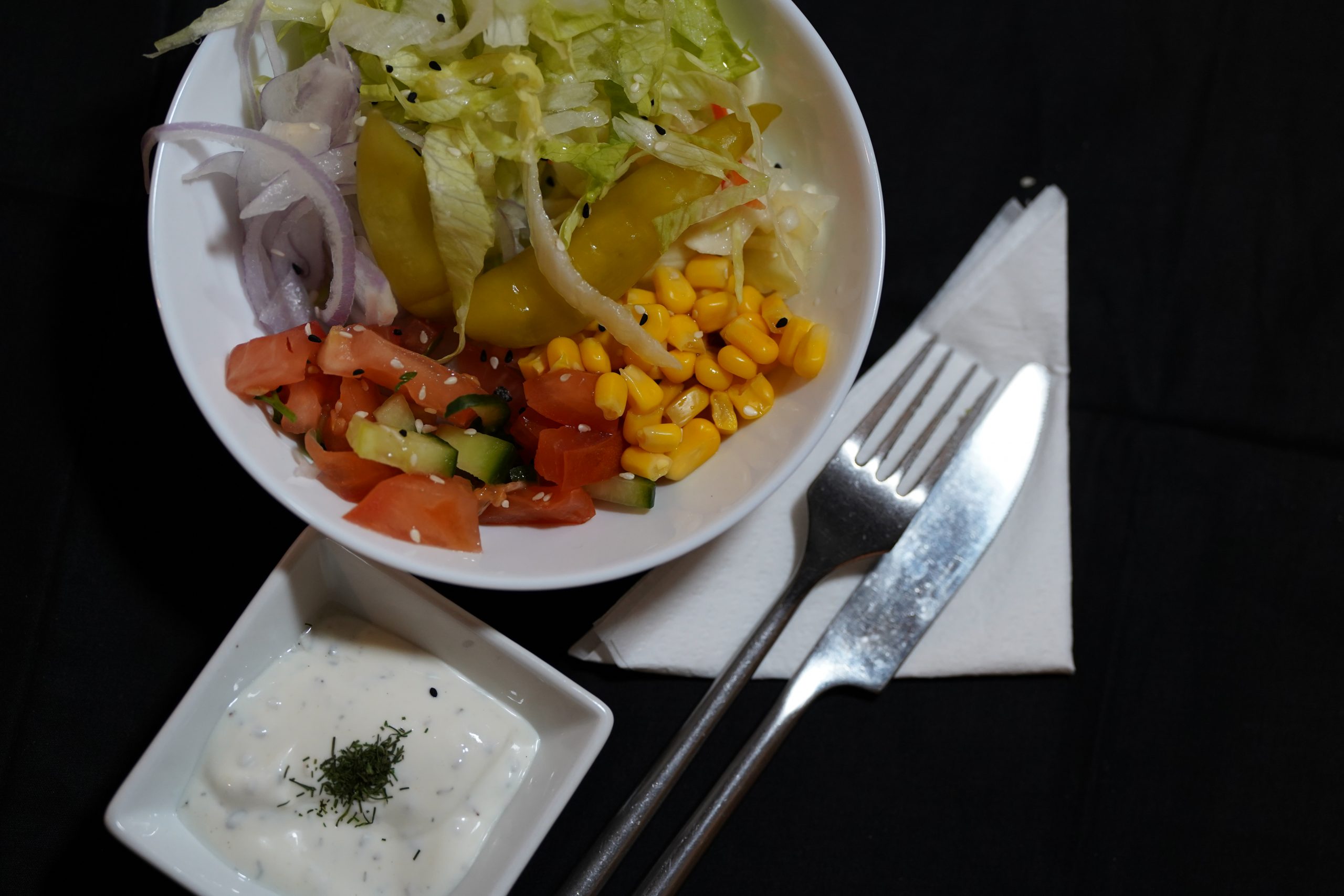 Eisbergsalat, Zwiebeln, Kraut, Tomaten, Gurken, Mais und Peperoni